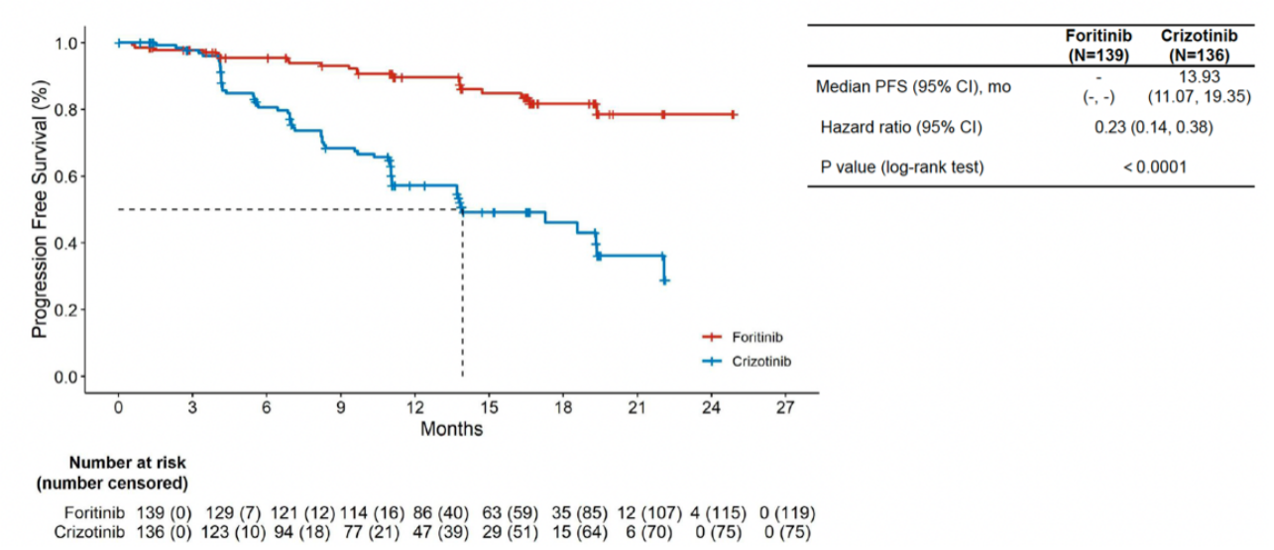 From December 2020 to March 2022, a total of 275 patients were enrolled in the study, with 139 receiving foritinib treatment and 136 receiving crizotinib treatment. As of March 2024, with a median follow-up of 16.7 months, the study found that the foritinib treatment group had a significantly improved PFS compared to the crizotinib treatment group. The median PFS for the crizotinib group was 13.93 months, while the foritinib group had not reached median PFS (HR 0.23, 95% CI 0.14-0.38, Figure 1).